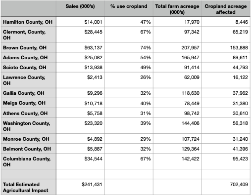 But it’s not a nothing burger because of the serious potential negative impact to agriculture, air, and water. Just the Ohio counties that border with the Ohio River, the agricultural impact is over 700,000,000 cropland acreage1. The potential economic impact is almost a quarter of a billion dollars.2